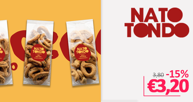 I taralli Nato Tondo sono fatti a mano, proprio come una volta, con la tradizione trasmessa dalle nonne che, giorno dopo giorno, preparavano questi prodotti secondo l’antica tradizione pugliese. Nato Tondo ha scelto di restare fedele a quei movimenti lenti e pazienti che rendono questi taralli squisiti e friabili, proprio come nonna li ha fatti. Il tarallo di Nato Tondo è uno snack versatile che può essere consumato in qualunque momento della giornata e in tutte le situazioni. Ottimo negli aperitivi accompagnato da un bicchiere di vino, sfizioso per una pausa, o al posto dei pop-corn mentre ci si gode un film. Accostato a olive, salumi e formaggi, si mostra in tutto il suo splendore. È un po’ come l’amico che vorresti sempre al tuo fianco.