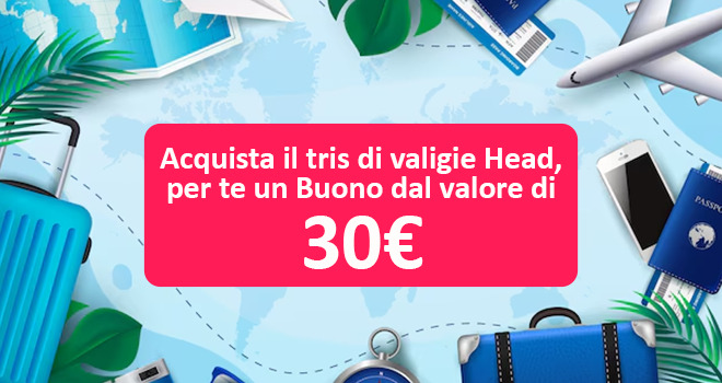 Voglia di viaggiare? Acquista il tris valigie di Head e SUBITO per te un BUONO SCONTO DA 30€ da utilizzare sul tuo prossimo acquisto! Il buono sconto è valido fino al 14 settembre su una spesa di almeno 60€: viaggiare non è mai stato così conveniente!