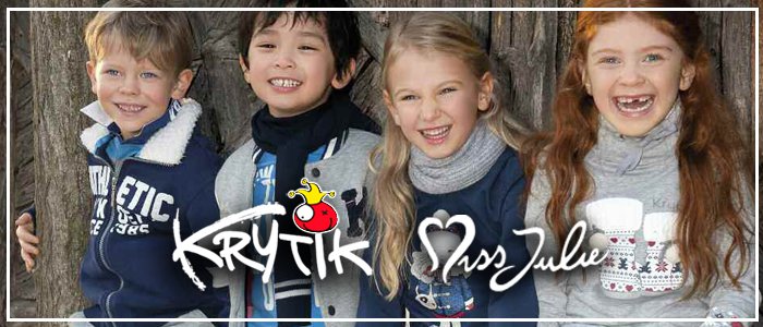 Abbigliamento total look firmato Miss Julie e Krytik: maglie, pantaloni, felpe e abiti in pizzo e in cotone, tute e t-shirt in cotone con stampe e paillettes colorate. Stampe con farfalle, fiori e fiochi ecco lo stile gioioso, sportivo e casuals presente in questa unica collezione.