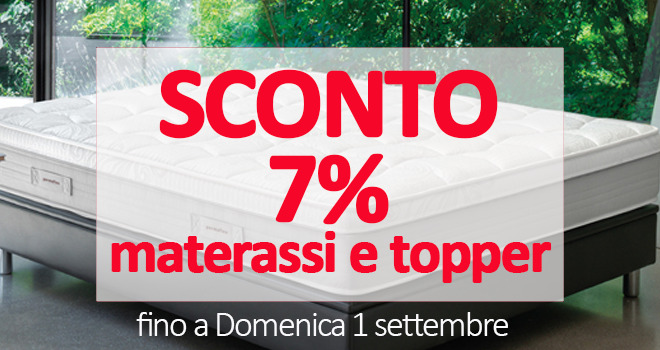 Dormire bene è importante e farlo con il materasso giusto è fondamentale. Scopri la nostra promo su Topper e Materassi, prodotti che promuovono ed esaltano il valore del Made in Italy e le migliori tecnologie che mirano a migliorare il riposo. Approfitta dell’Extra Sconto del 7% valido fino a domenica 1 settembre in Store e Online.
