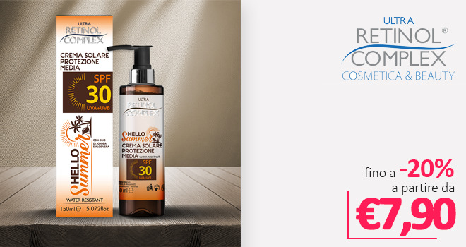 Proteggi la tua pelle e valorizzala con i prodotti solari firmati Retinol Complex: protezione avanzata, texture leggere e ingredienti selezionati per un’abbronzatura dorata e una pelle idratata. Dai solari anti-age alle creme doposole, agosto è il mese perfetto per risplendere in modo naturale.
