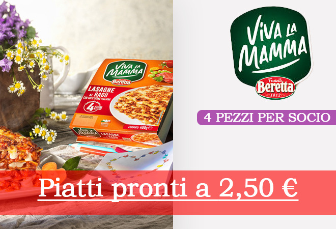 I prodotti Viva la Mamma di Beretta offrono una vasta gamma di piatti pronti pensati per chi cerca un pasto veloce e gustoso senza rinunciare alla qualità. Questi piatti sono spesso preparati con ingredienti freschi e senza conservanti, cercando di mantenere il sapore autentico delle ricette tradizionali italiane. Vivi la comodità dei piatti pronti “Viva la Mamma” di Beretta e scegli tra il vasto assortimento pensato per te! La vera novità è il prezzo! vieni in negozio e scopri il prezzo Socio vantaggioso, senza sorprese, grazie all’Extra Sconto del 40% sul prezzo Socio già scontato.