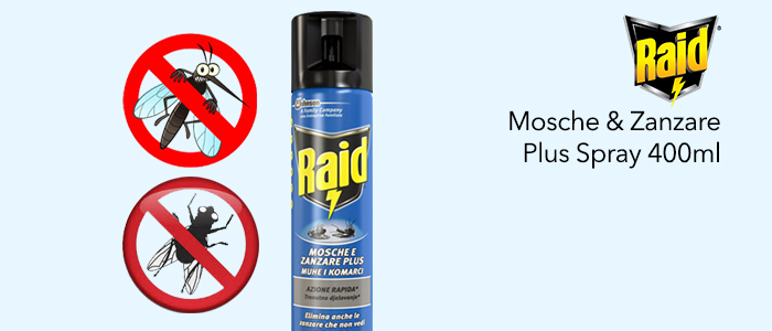Se cerchi una soluzione rapida e dagli effetti garantiti contro gli insetti volanti lo spray Raid Mosche e Zanzare “utilizzato in ambienti chiusi” offre risultati fantastici! Non è necessario spruzzare lo spray direttamente contro gli insetti, basta solo erogare il prodotto per 8/10 secondi cercando di coprire tutta l’area interessata in modo che diffondendosi, nei successivi 15 minuti, lo spray andrà a eliminare gli insetti come mosche e zanzare. Per un effetto rapido spruzzare direttamente verso gli insetti mantenendo lo spruzzo a distanza di circa un metro da muri, tessuti e arredamento. Contro vespe e calabroni dirigere il getto direttamente contro gli insetti.