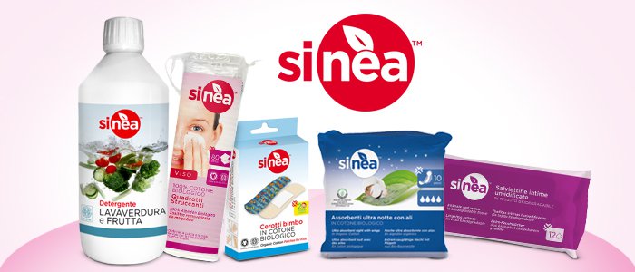 Sinea offre anche prodotti come cerotti, garze, rocchetti in tela, proteggi slip e prodotti in puro cotone biologico.