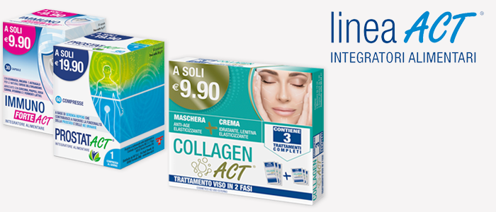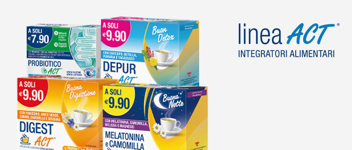 Tante soluzioni, in capsule, compresse o in bustine. Linea ACT ti aiuta ad avere il corretto equilibrio nel tuo organismo, per una vita all’insegna della salute. Una soluzione naturale al costante bisogno fisico di integrare e bilanciare il dispendio quotidiano.
