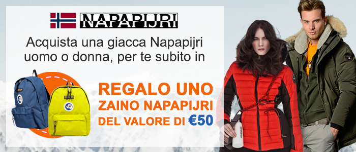 Acquistando una giubbotto o piumino Napapijri uomo o donna, per te subito in regalo uno Zaino Napapijri del valore di €50! Lo zaino di medie dimensioni VOYAGE disponibile nei colori Avio, Mattone, Giallo e Verde.